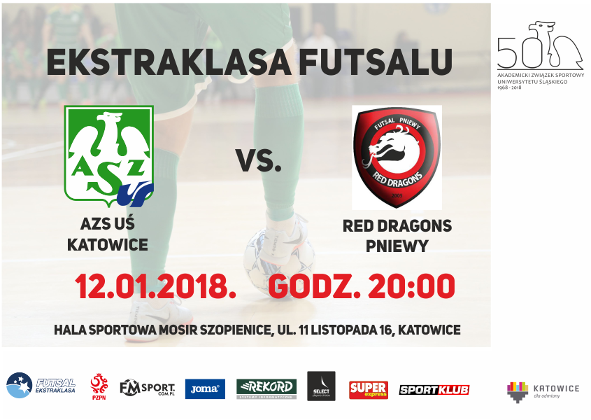 Już w najbliższy piątek do Katowic przyjeżdża ekipa Red Dragons Pniewy. Goście fatalnie rozpoczęli sezon 2017/2018, jednak z każdym kolejnym tygodniem podopieczni Łukasza Frajtaga grali coraz skuteczniej, a co ważne zaczęli punktować. W zeszłym tygodniu "Smoki" pokonując Pogoń 04, po raz pierwszy znalazły się w górnej połówce tabeli. Trzeba jednak zaznaczyć, że w październiku to AZS UŚ był górą, zwyciężając na trudnym terenie 3:2. W obu drużynach doszło do kilku roszad kadrowych. Katowiczan zasilili Tkacz, Podobiński, Lasik i Moritz, natomiast w Pniewach zadebiutowali już Roman Vahula i Dominik Solecki, a więc znane z futsalowych parkietów nazwiska.